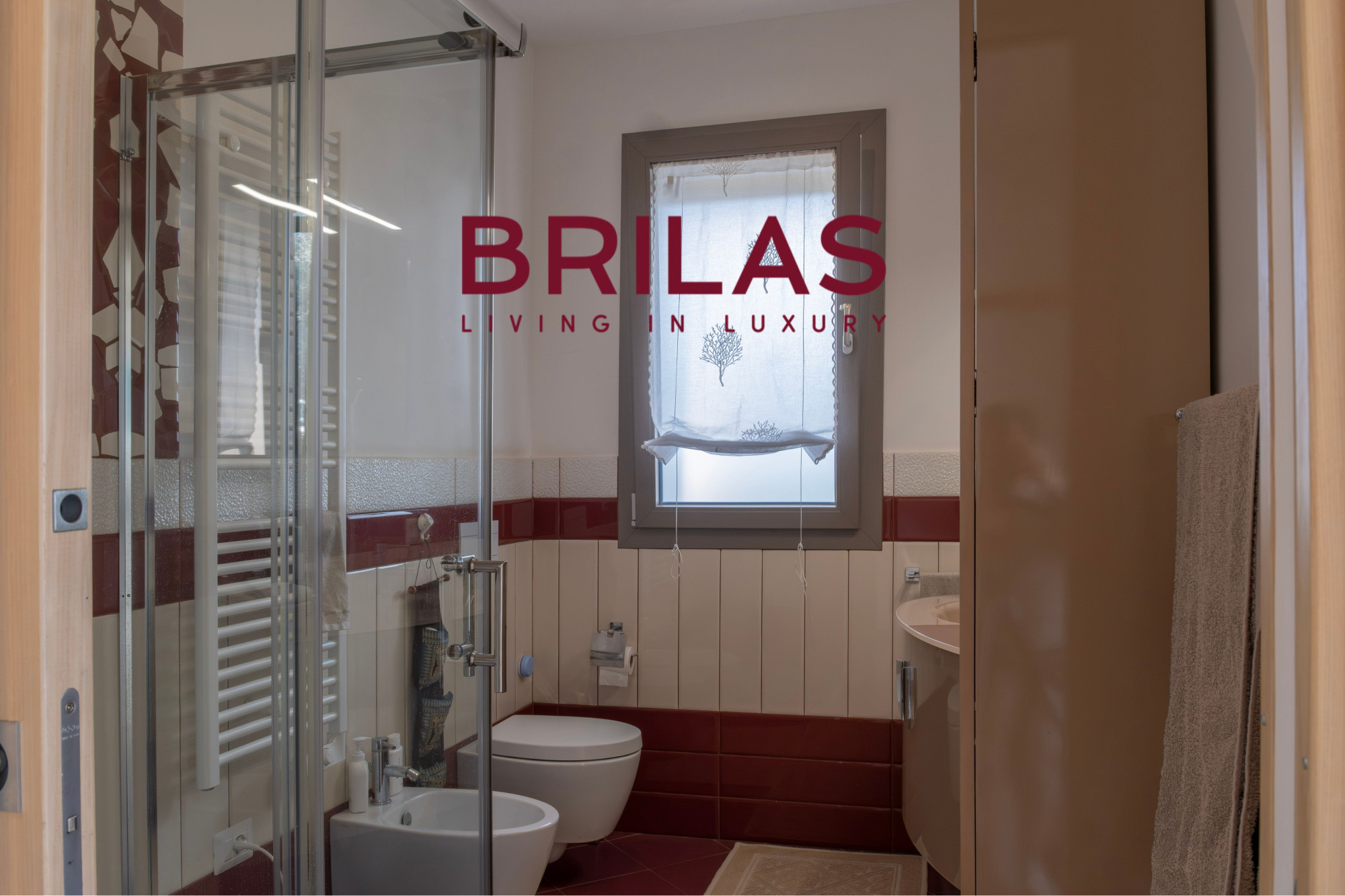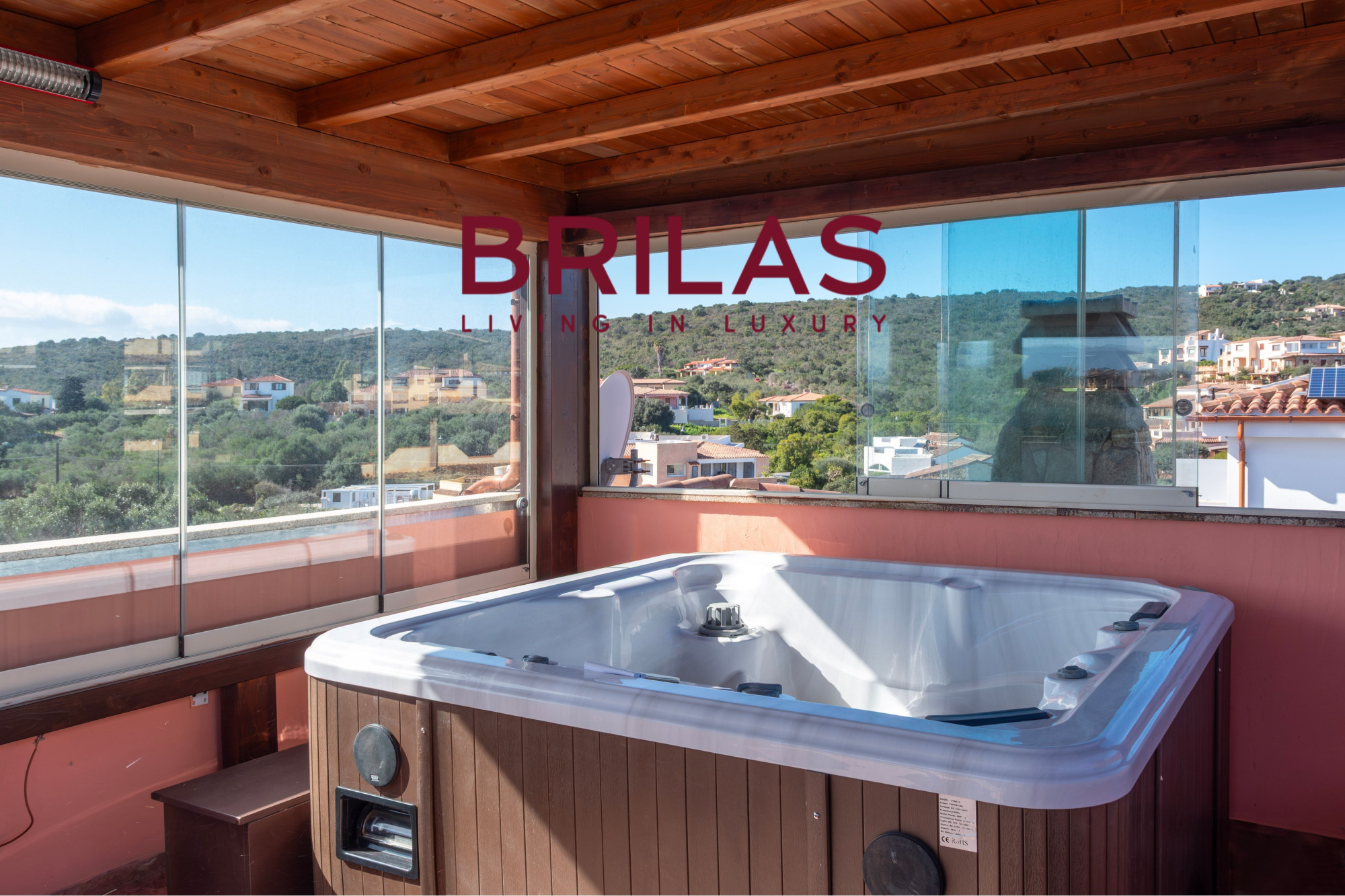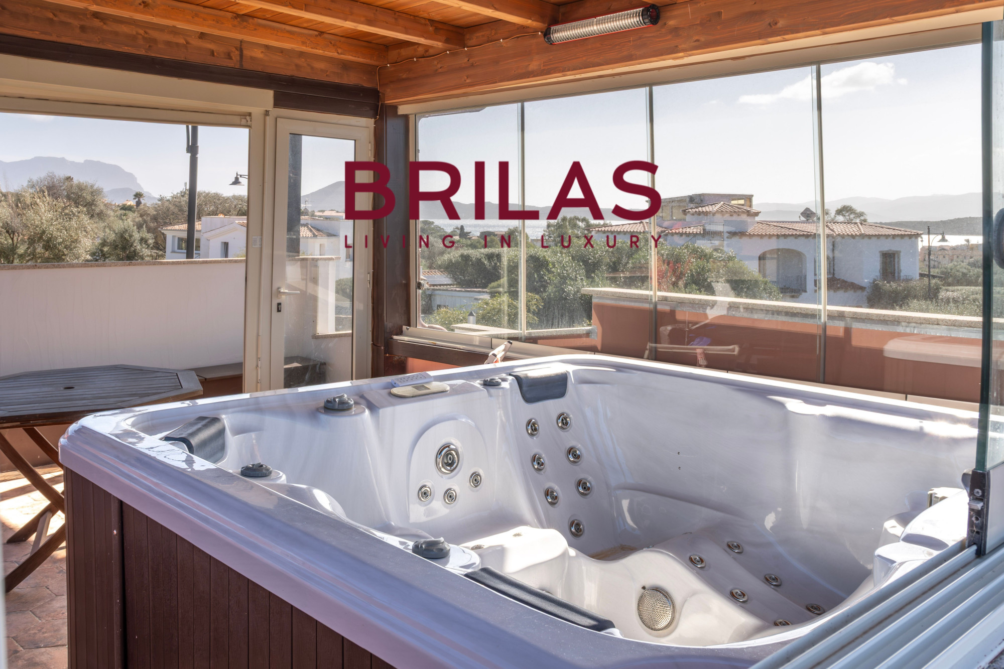 The outdoor spaces are a true invitation to alfresco living. The covered veranda with panoramic glazing overlooks the swimming pool with its hydromassage feature, creating an atmospheric setting in every season. The barbecue area and large covered parking space make the property ideal for hosting guests in total comfort. On the upper floor, an additional sea-view veranda with a whirlpool bath offers breathtaking vistas and unforgettable sunsets.