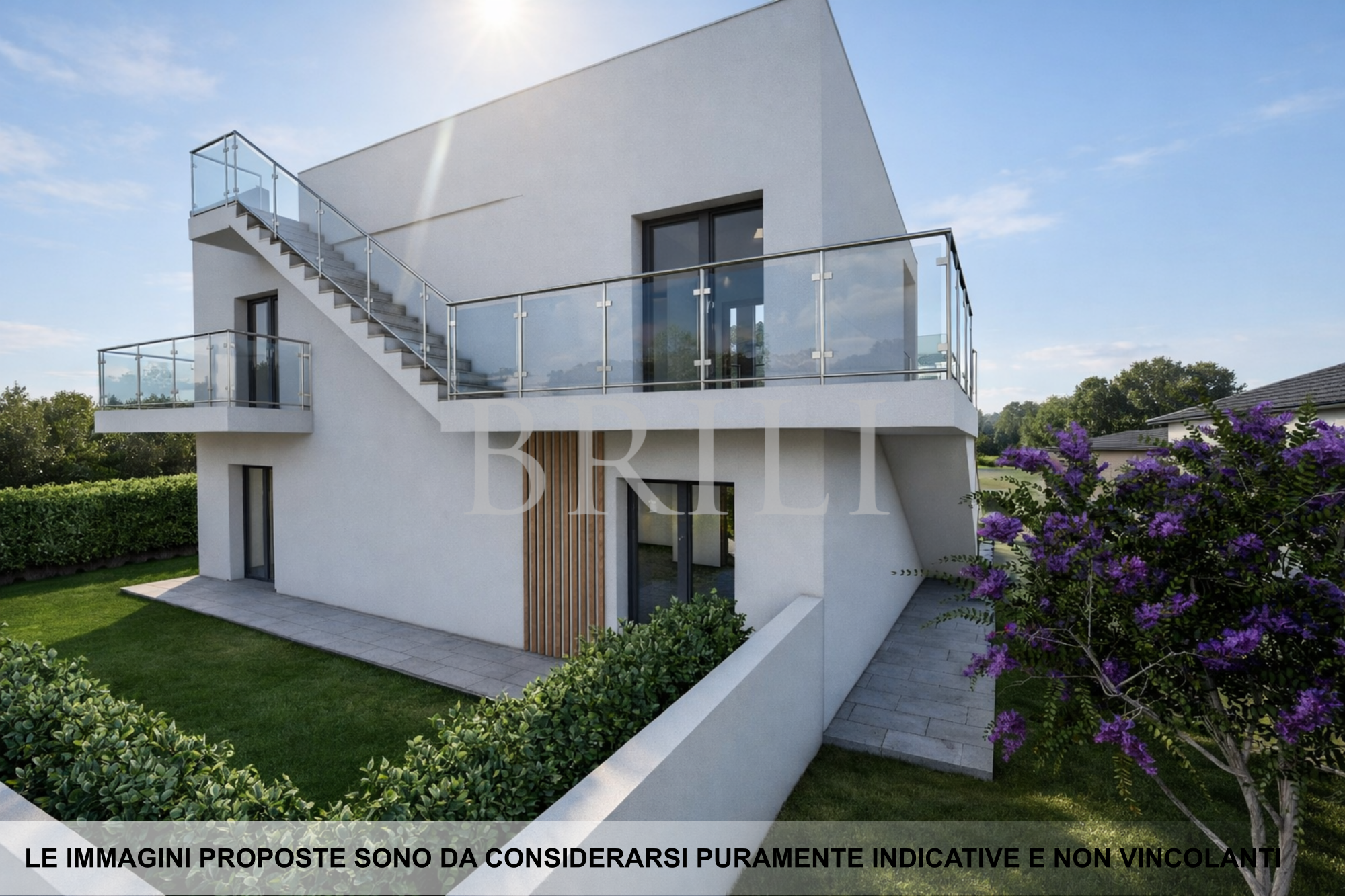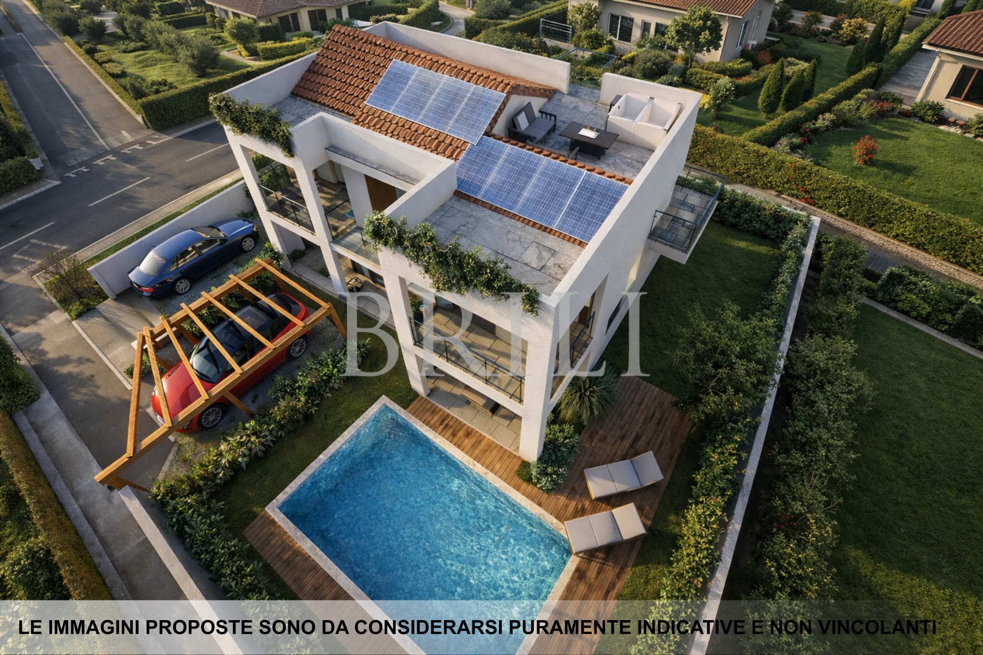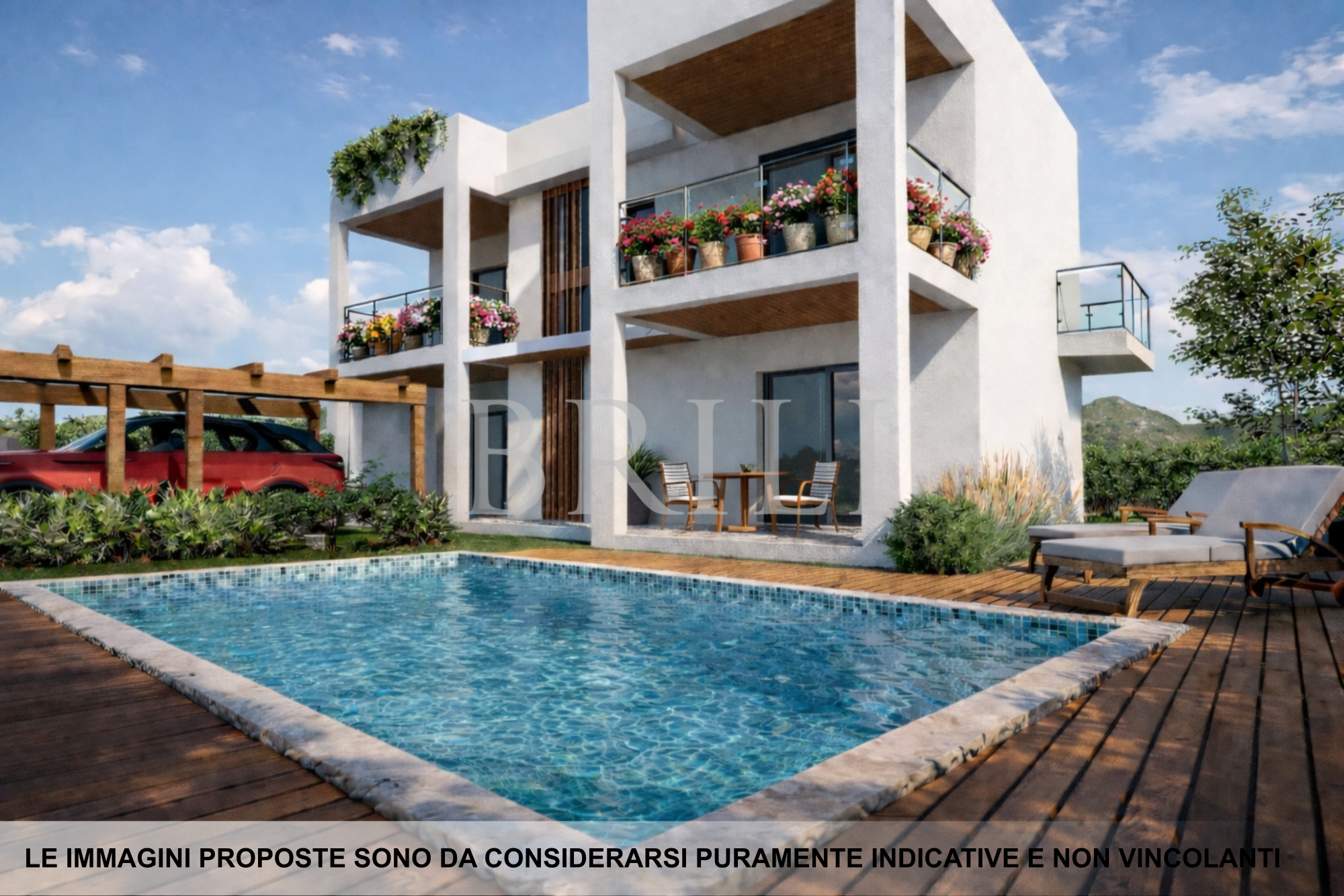 Il progetto prevede due unità immobiliari completamente indipendenti: una al piano terra, caratterizzata da giardino e piscina privata, e una al piano primo, dotata di ampie verande e solarium con una suggestiva vista panoramica.