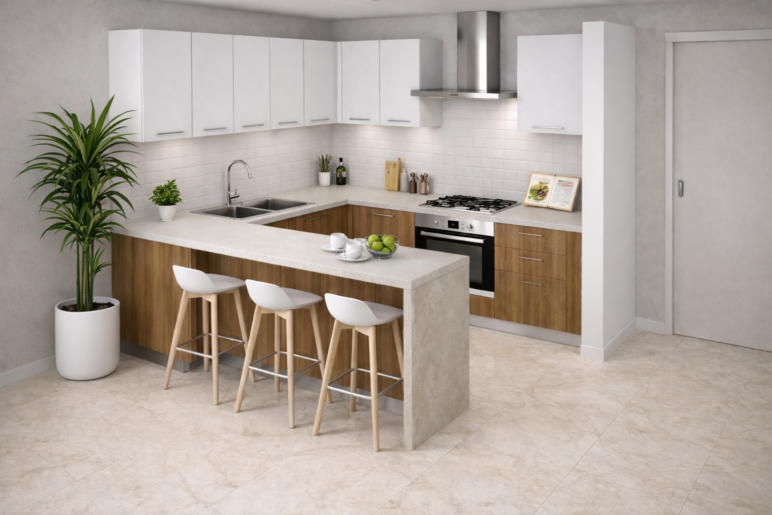 Ogni appartamento è composto da un luminoso soggiorno con cucina a vista, due camere da letto e due bagni.