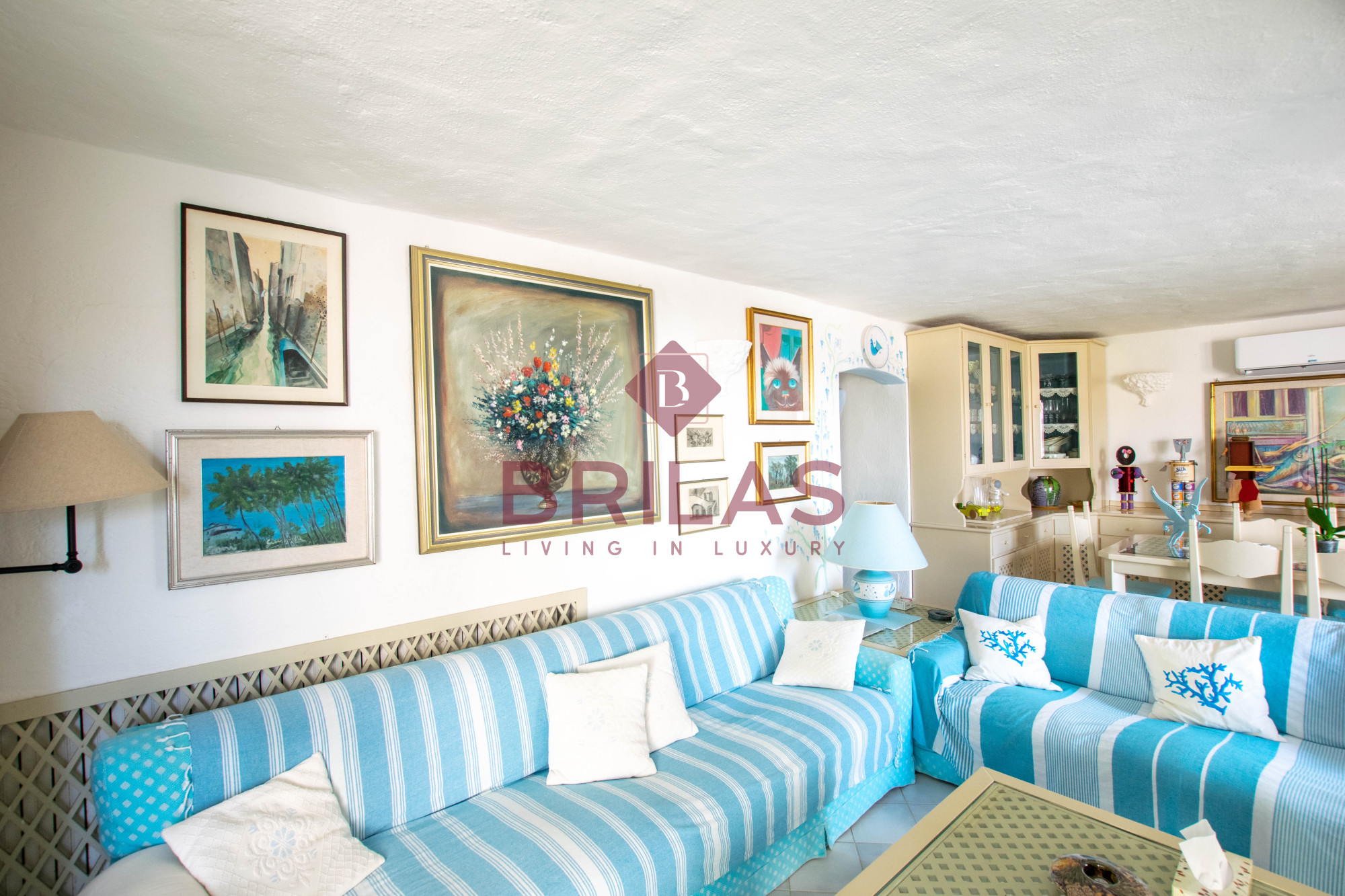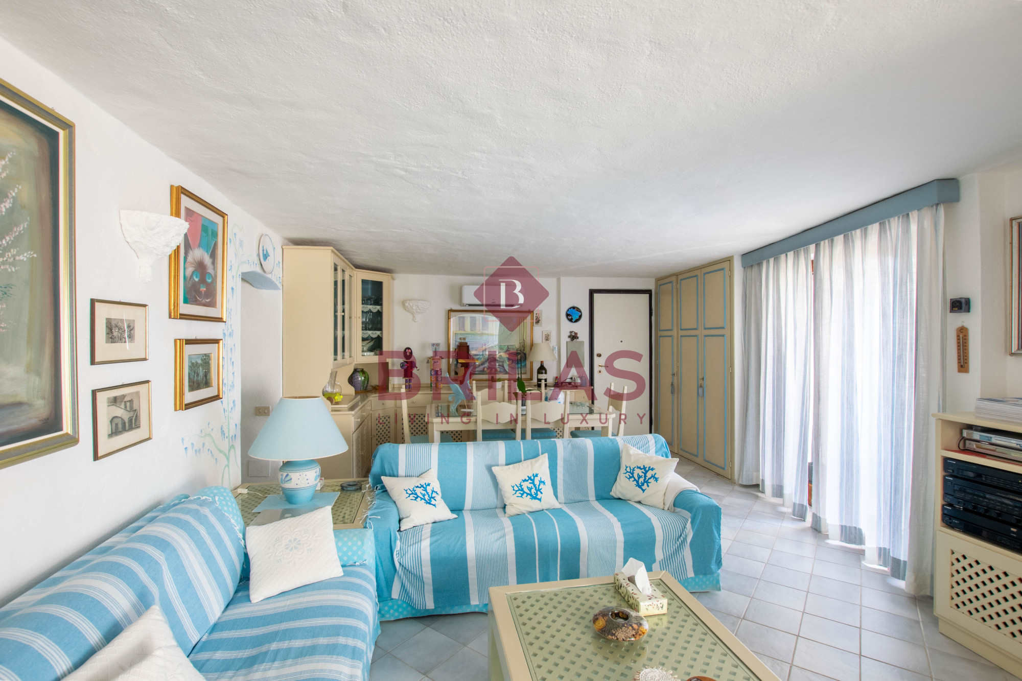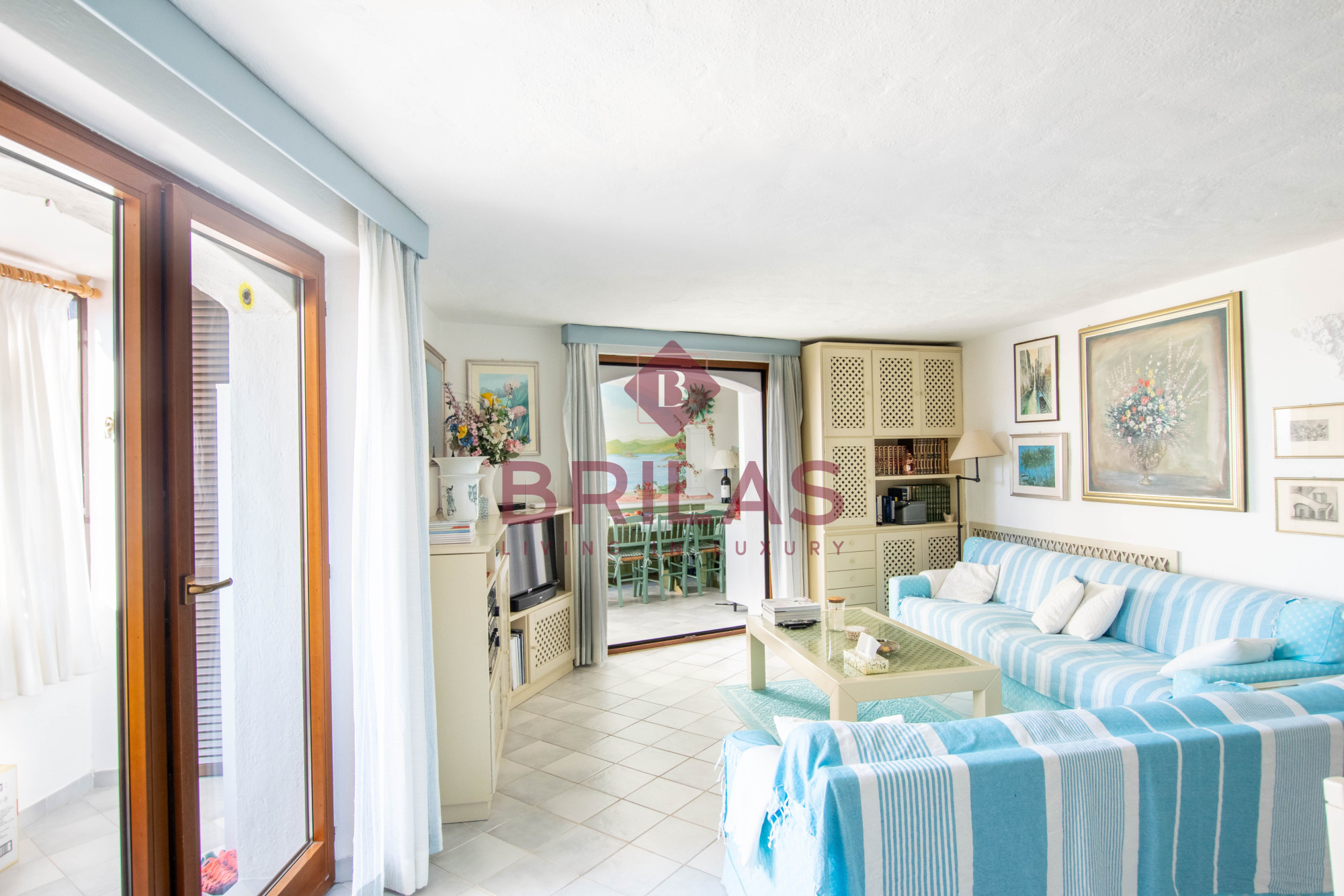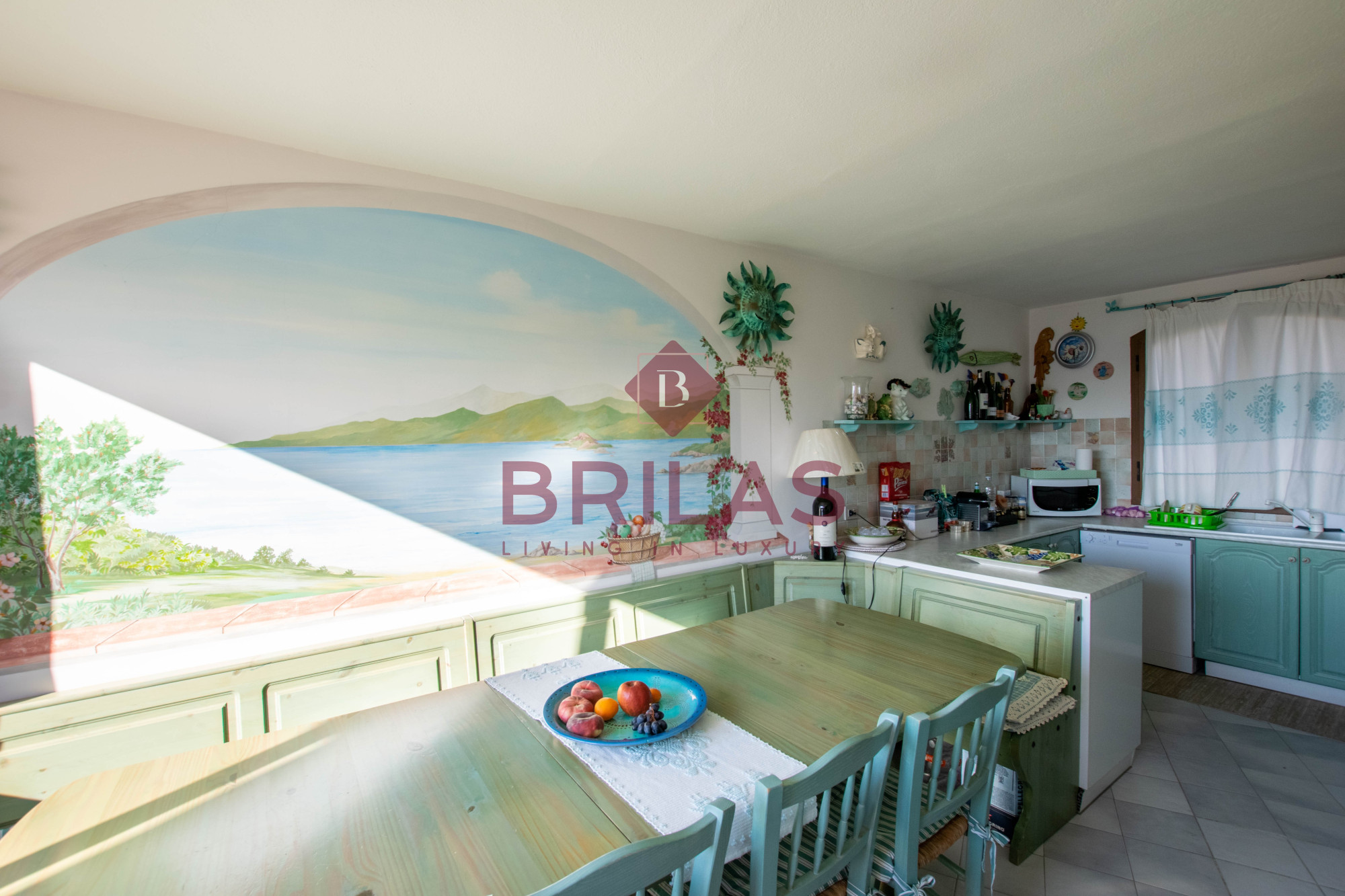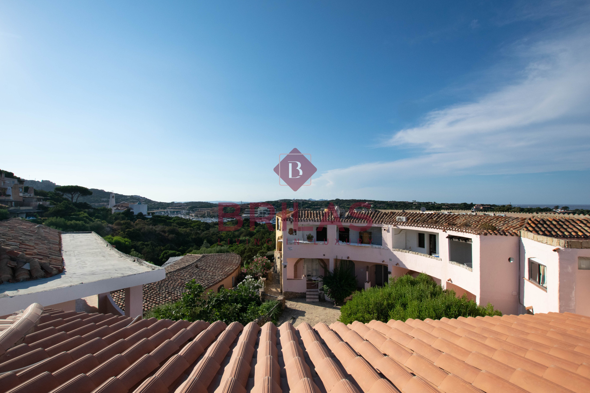 Gli spazi interni sono ampi e ben distribuiti. La zona living, composta da un ampio e luminoso soggiorno e da una cucina separata ed abitabile, gode di una bella vista sulla Marina di Porto Cervo e sulla suggestiva chiesetta di Stella Maris.