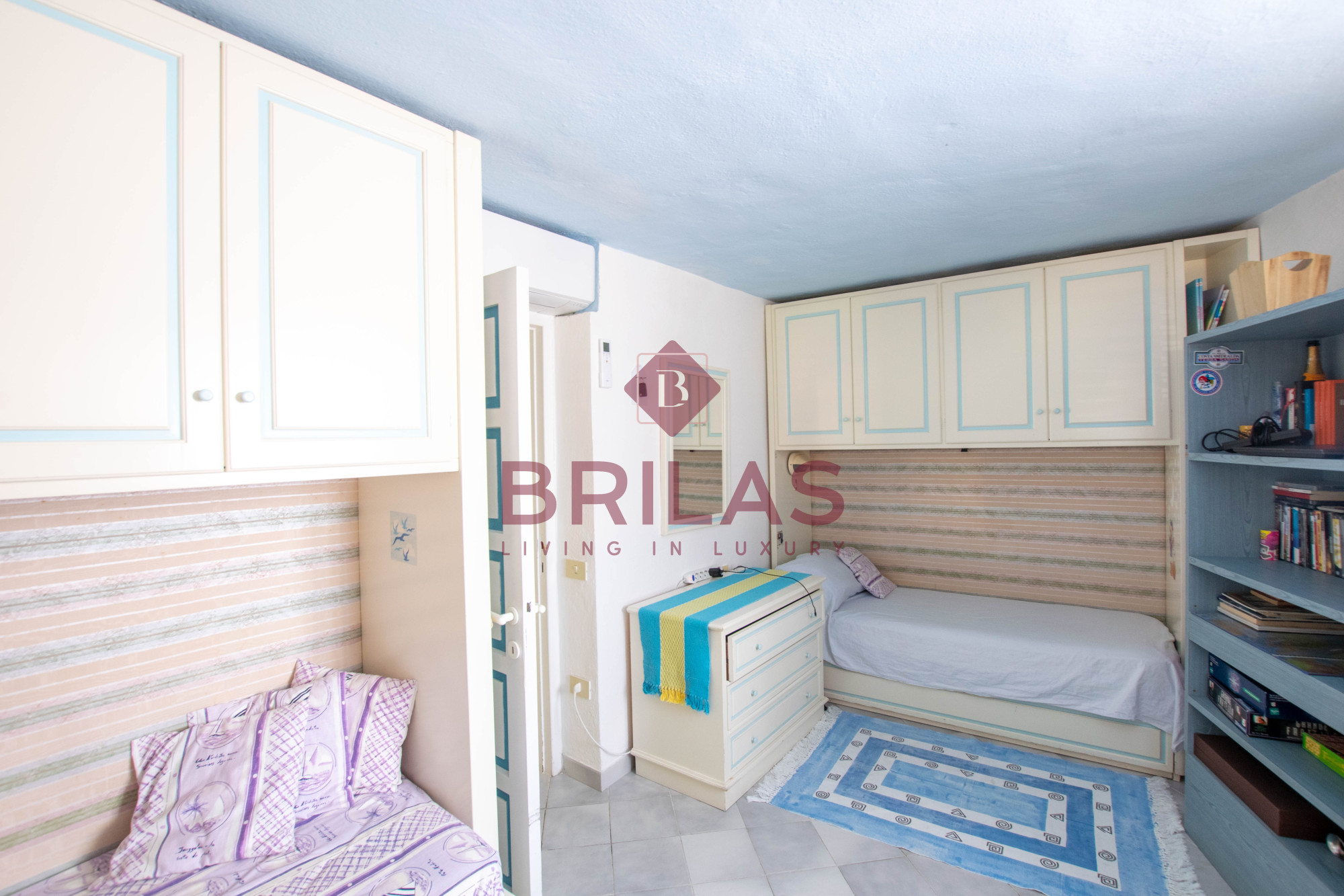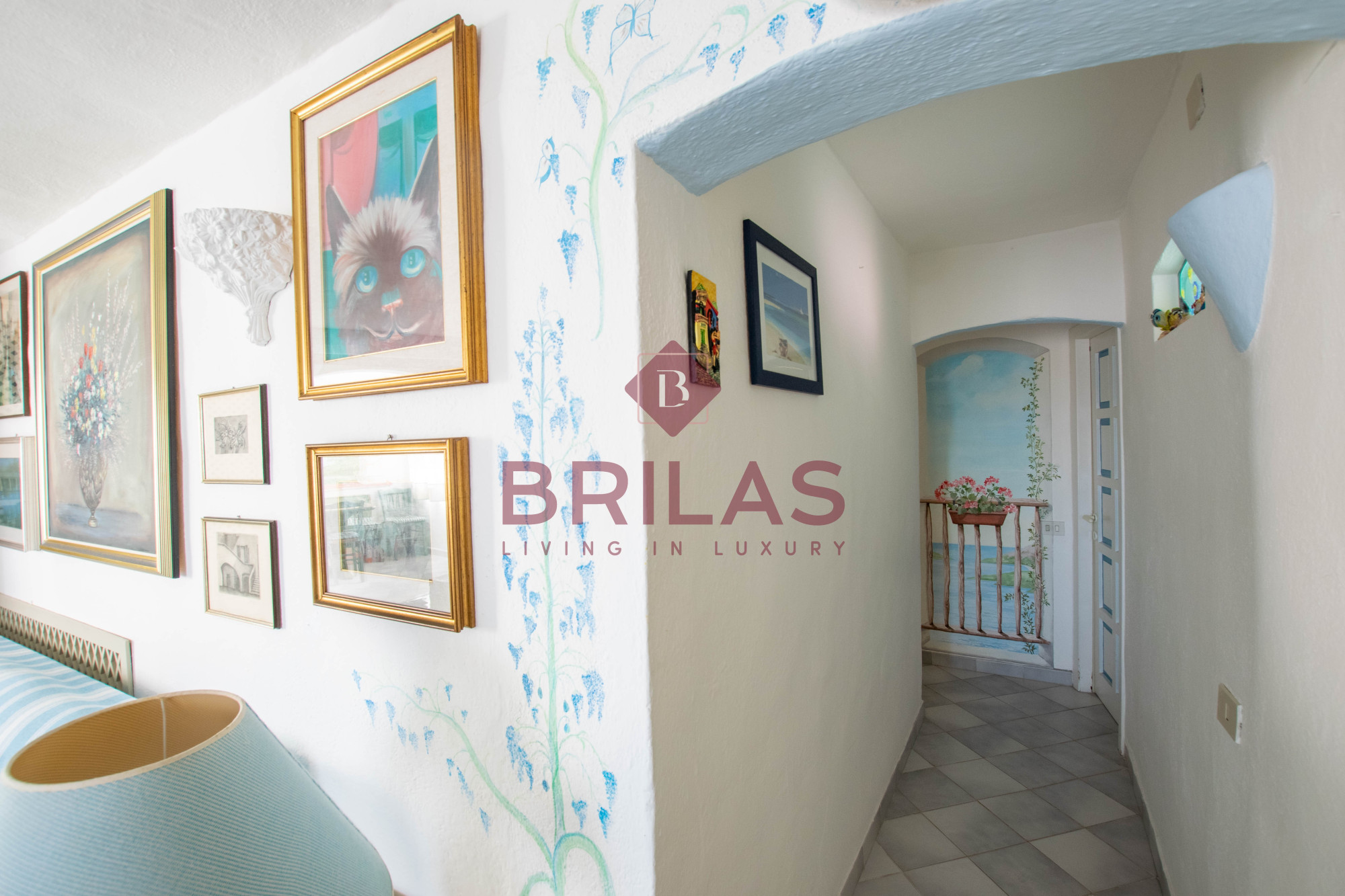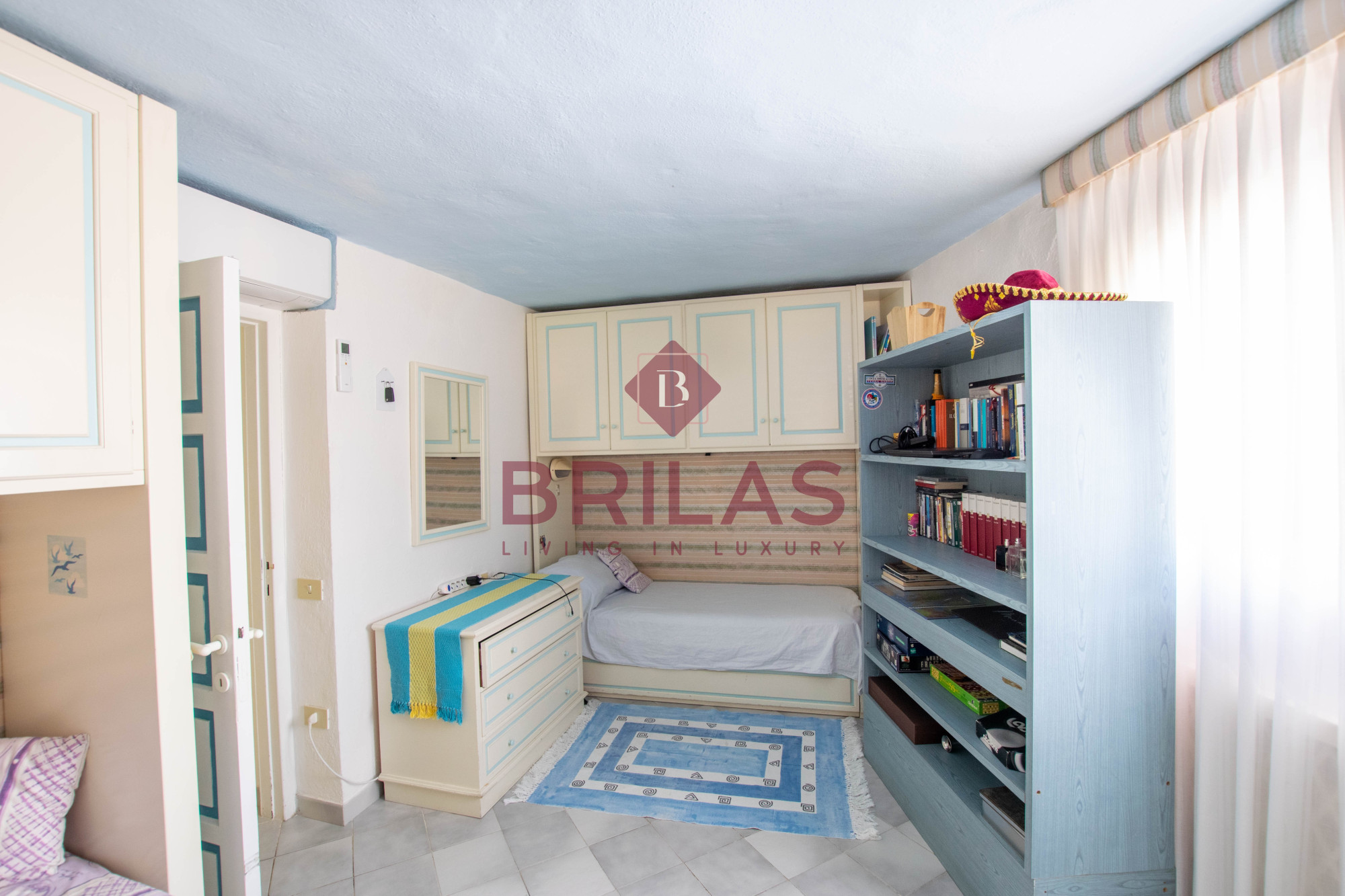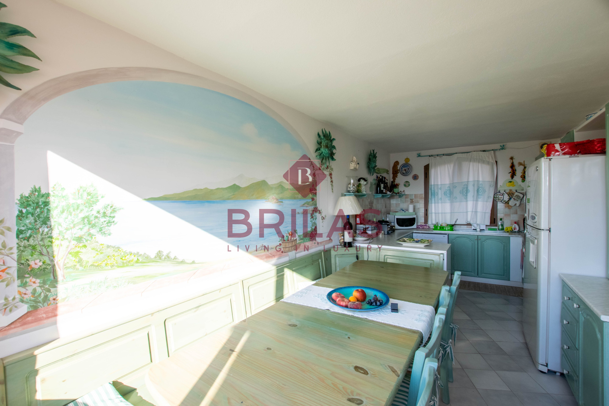 Gli spazi interni sono ampi e ben distribuiti. La zona living, composta da un ampio e luminoso soggiorno e da una cucina separata ed abitabile, gode di una bella vista sulla Marina di Porto Cervo e sulla suggestiva chiesetta di Stella Maris.