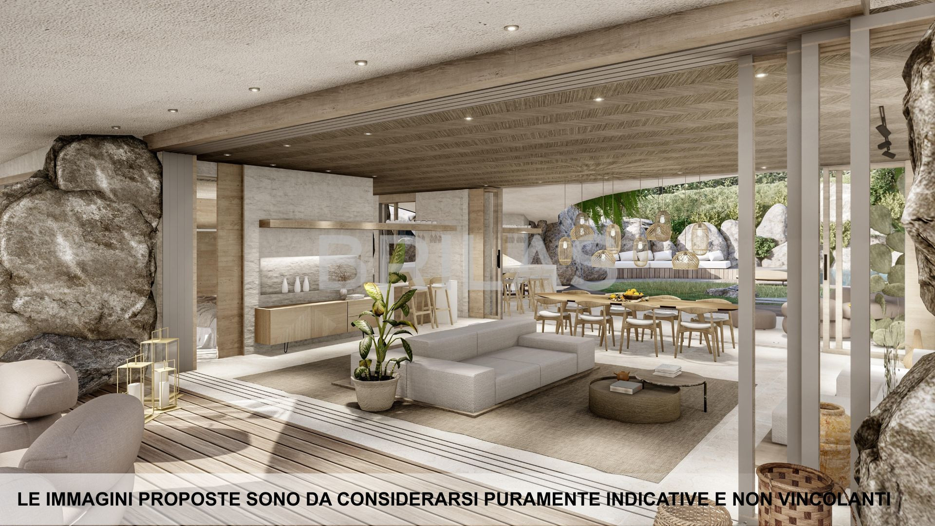 La proprietà è caratterizzata da un’ampia e luminosa zona living, uno spazio delimitato da grandi vetrate scorrevoli a tutta altezza che collega armoniosamente i due fronti della villa: quello direttamente affacciato sulla spiaggia e quello posteriore, dove si sviluppa una corte interna naturale attrezzata con una piscina di circa 50 mq, garantendo la massima vivibilità degli spazi esterni in ogni periodo dell’anno e in qualsiasi clima.